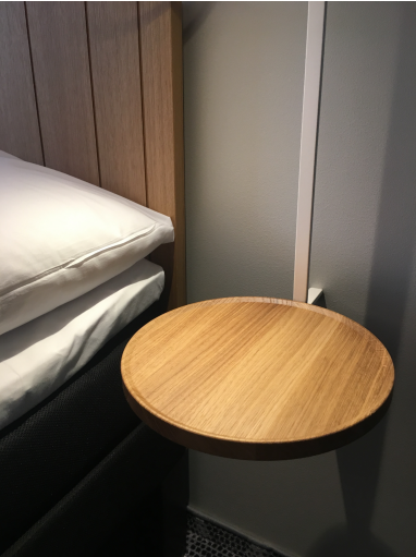Huoneessa on mittatilaustyönä tehtyjä kalusteita, jotka huokuvat hienostuneisuutta ja mukavuutta. Tammisängynpäädyistä ulkokalusteisiin jokainen elementti on valittu huolella asiakaskokemuksen parantamiseksi. Valaistus, istuimet ja harkitut yksityiskohdat, kuten penkit ja vaateripustimet, on suunniteltu tarkasti, mikä varmistaa harmonisen ja kutsuvan tunnelman.